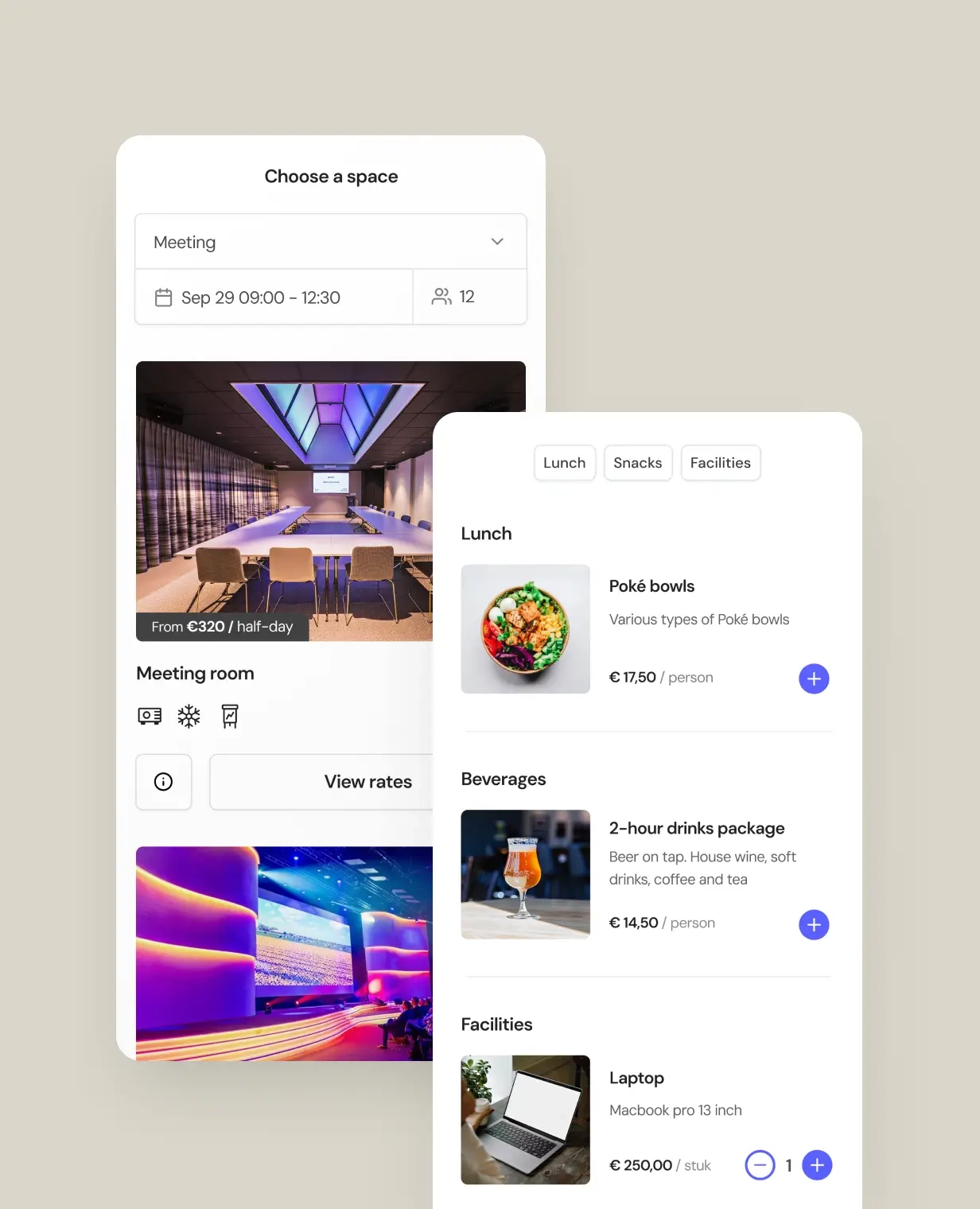 Your hotel, your identity. Receive requests based on real-time availability, send proposals in your own branding, and save time with e-proposals and a clear overview of all your spaces.