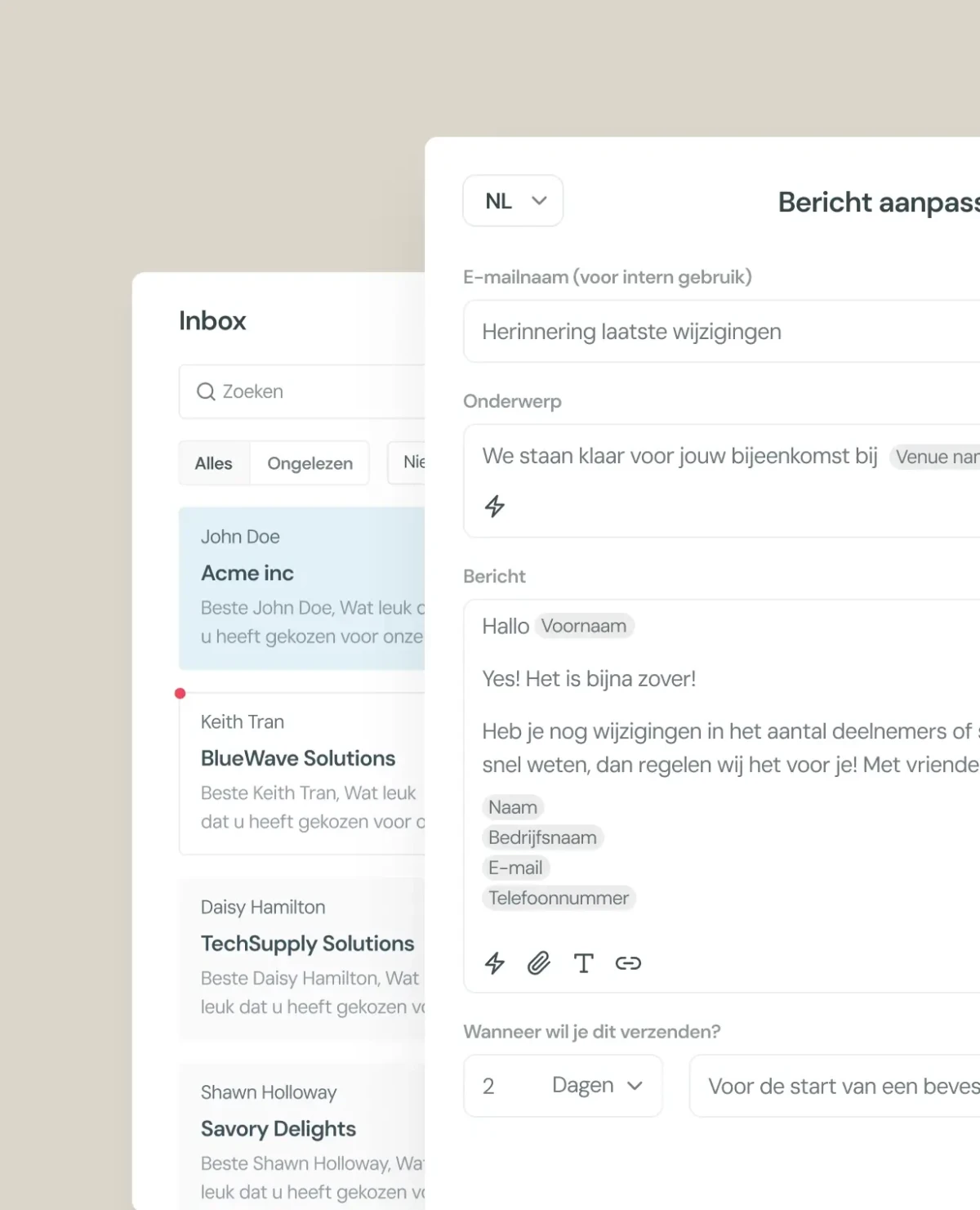 Jouw hotel, jouw uitstraling. Ontvang aanvragen op basis van actuele beschikbaarheid, verstuur offertes in je eigen huisstijl en bespaar tijd met digitale voorstellen en een duidelijk overzicht van al je zalen.