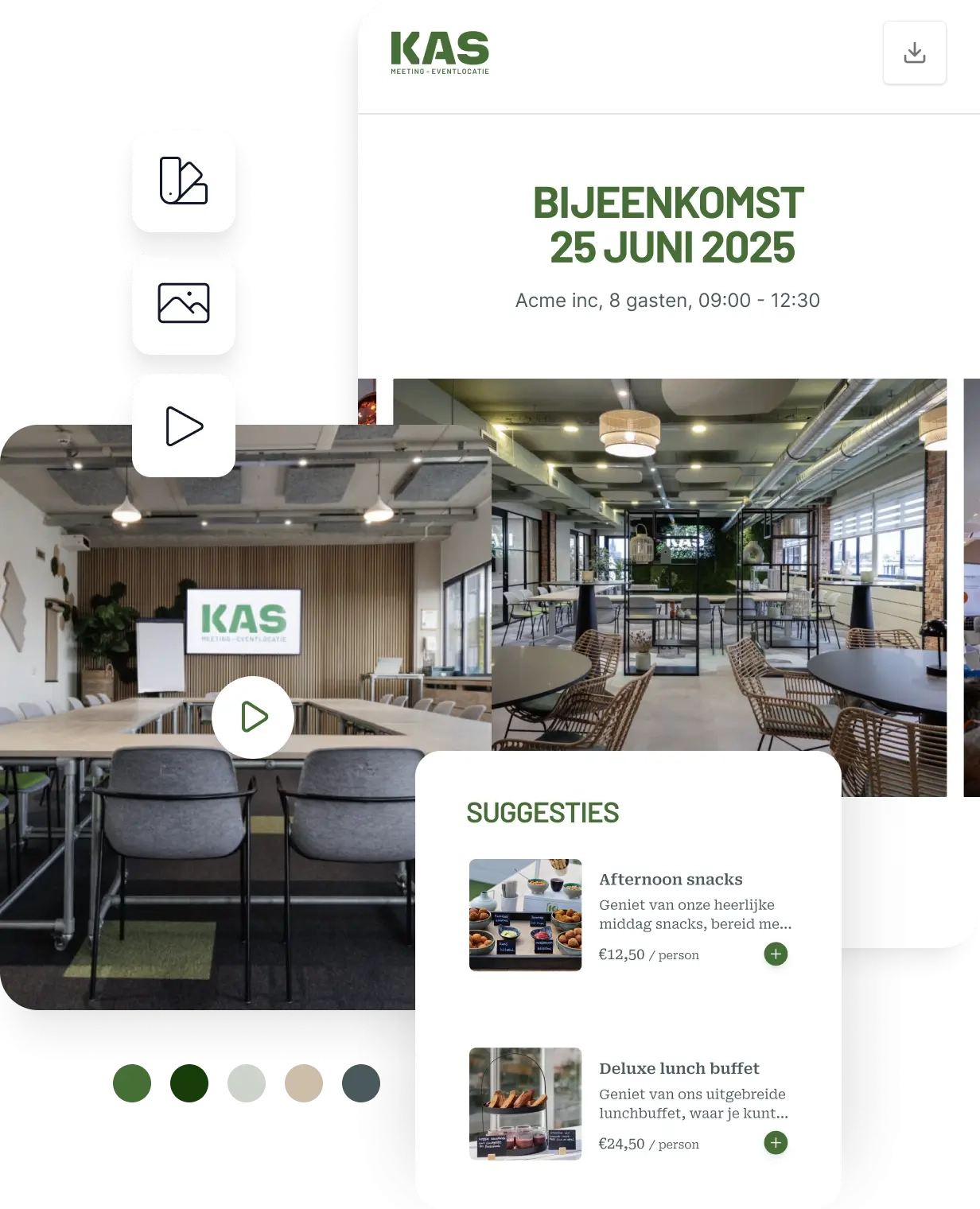 Je voorstel is je eerste indruk. Maar in een standaard pdf verlies je al snel je unieke uitstraling. Met onze e-proposals zet je in no-time een offerte neer die eruit springt: helemaal in jouw stijl, met je eigen kleuren, lettertypes en beelden. Zo breng je direct de juiste sfeer over. En met een offerte die klopt, zijn planners zo om.