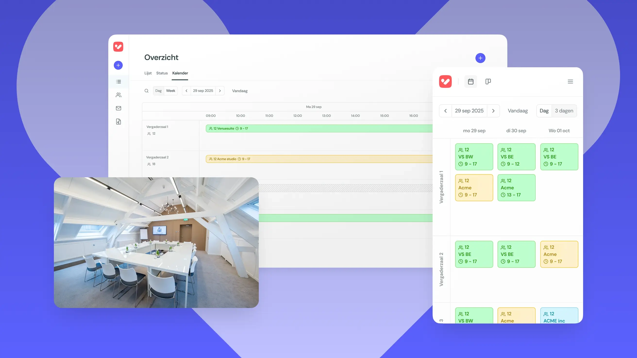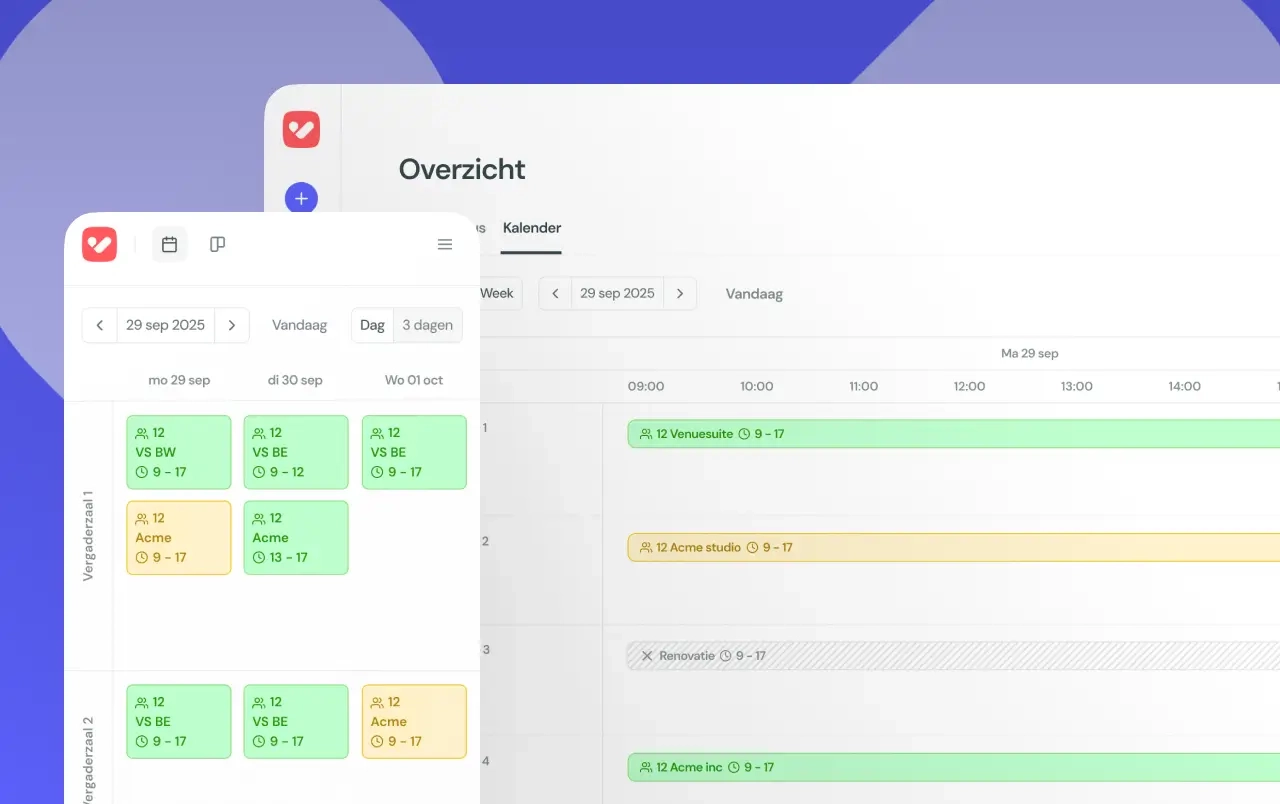 • Visuele zaalagenda waarin je boekingen makkelijk versleept.