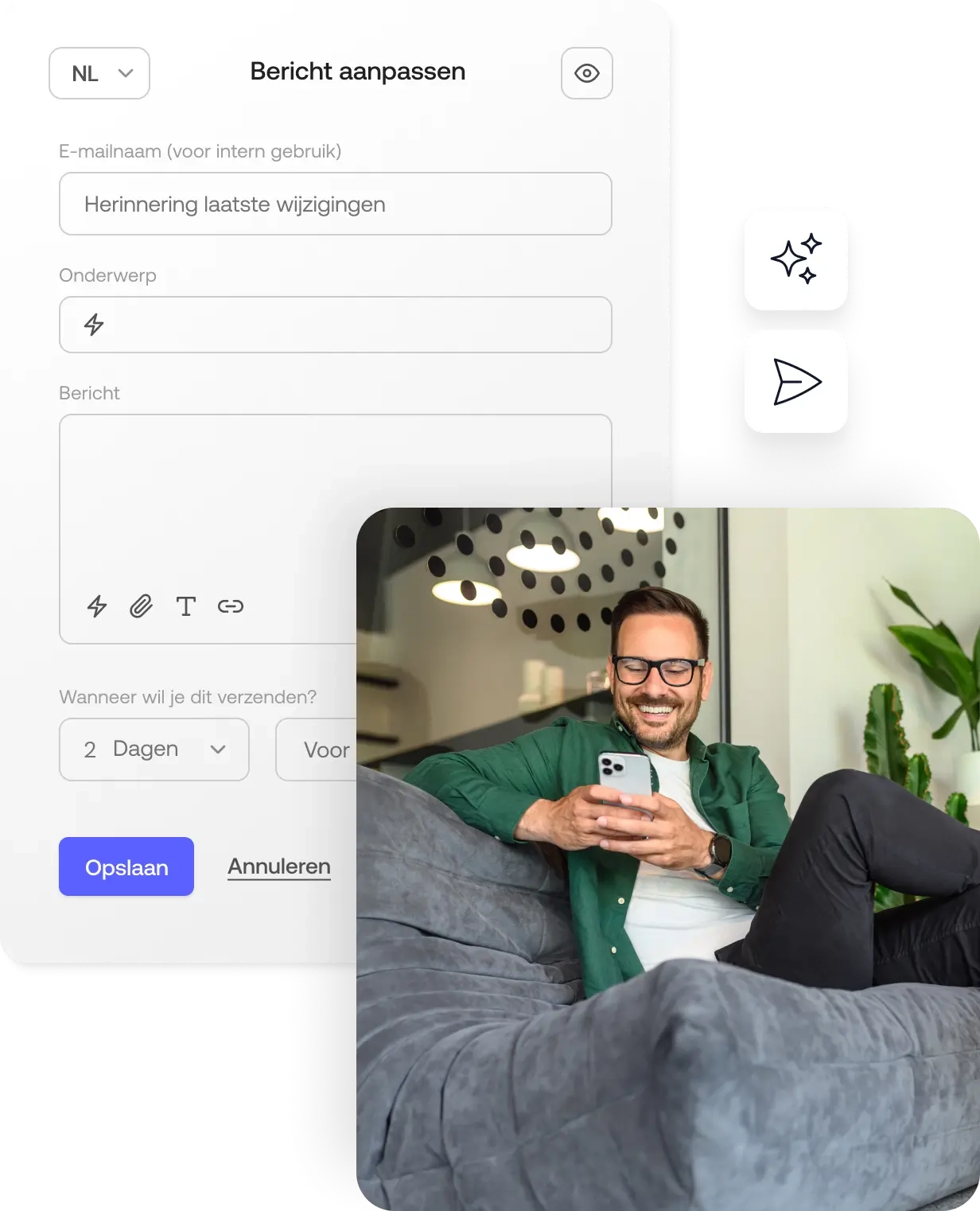 • Geautomatiseerde triggers en handmatige overrides per klant of reservering.